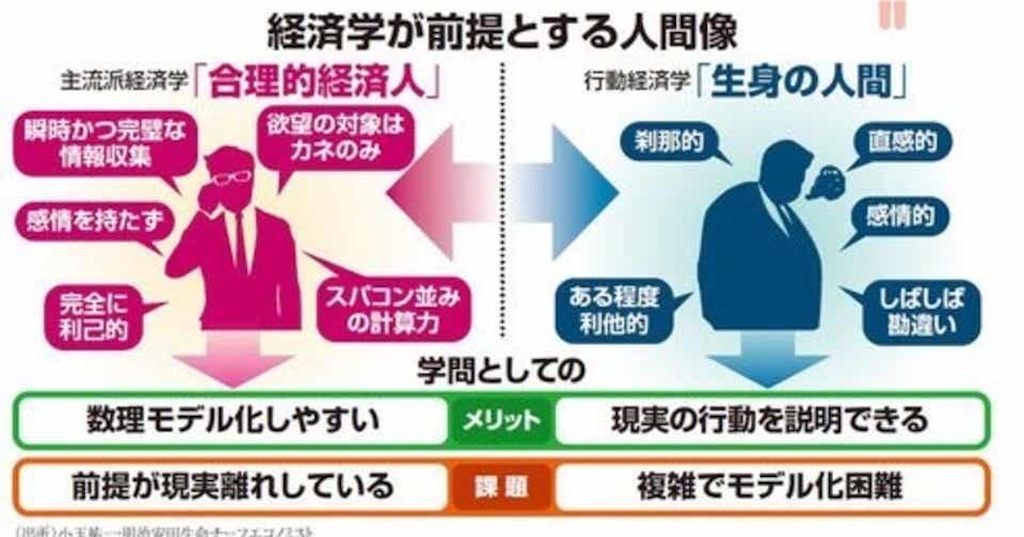 「合理的に動く人間」が前提の経済学と「生身の人間」を想定する行動経済学。というわけです。